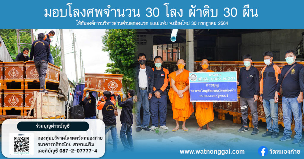 วัดหนองก๋าย มอบโลงศพ 30 โลงพร้อมผ้าขาวดิบ 30 ผืนให้กับองค์การบริหารส่วนตำบลกองแขก อ.แม่แจ่ม จ.เชียงใหม่ และขออนุโมทนาบุญกับเจ้าภาพทุกท่านที่ได้ร่วมบริจาคโลงศพ ทำบุญโลงศพกับทางวัดหนองก๋าย