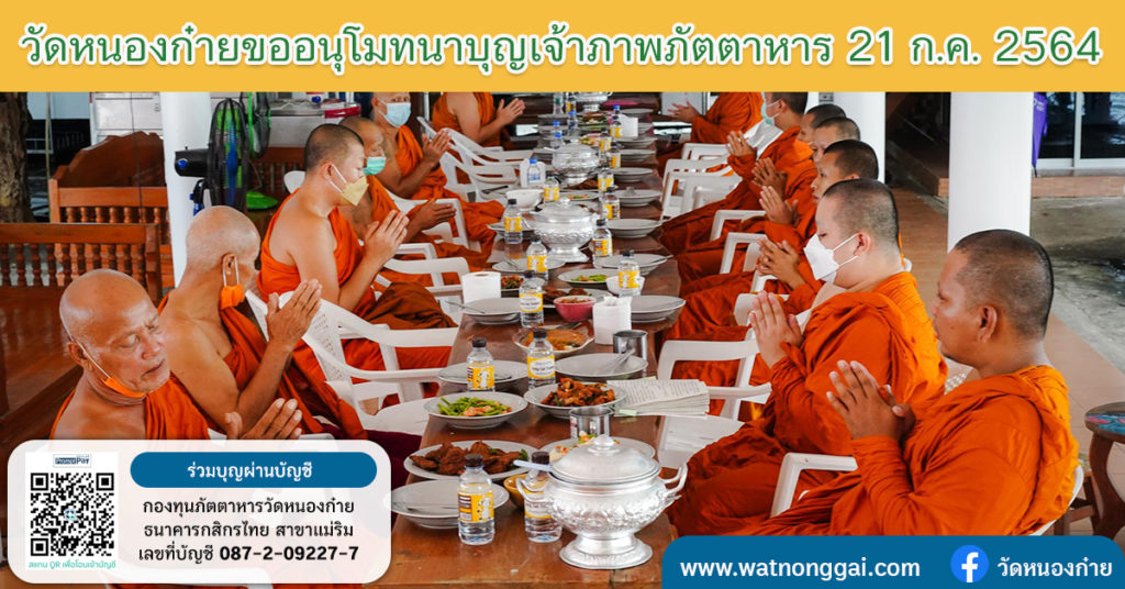 วัดหนองก๋ายขออนุโมทนาบุญกับเจ้าภาพที่มาถวายภัตตาหาร สร้างมหาทานบารมีถวายเป็นสังฆทานแด่พระภิกษุของวัดหนองก๋าย สำหรับผู้ที่สนใจสามารถร่วมบุญถวายภัตตาหารได้ทุกๆ วัน ทั้งที่มาด้วยตนเองทางวัดก็จะทำการจัดสถานที่เพื่ออำนวยความสะดวกแก่ทุกท่าน หรือสามารถทำบุญออนไลน์ ถวายภัตตาหาร เช้า เพล ทางวัดจะทำการจัดสรรภัตตาหารที่ดีที่สุด ปราณีตที่สุดตามกำลังศรัทธาของญาติโยมที่ร่วมบุญ เนื่องในวันพิเศษต่างๆ ทำบุญสะเดาะเคราะห์ ทำบุญวันเกิดตามที่ทางเจ้าภาพต้องการ