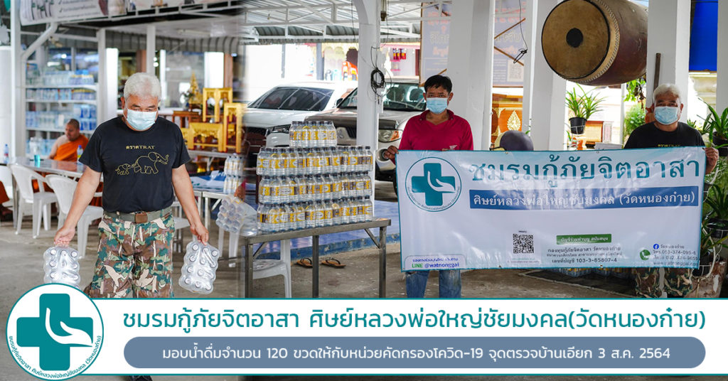 ชมรมกู้ภัยจิตอาสาศิษย์หลวงพ่อใหญ่ชัยมงคลวัดหนองก๋าย มอบน้ำดื่ม 120 ขวดให้กับหน่วยคัดกรองตรวจโควิด-19 จุดตรวจบ้านเอียก ต.สันป่ายาง อ.แม่แตง จ.เชียงใหม่