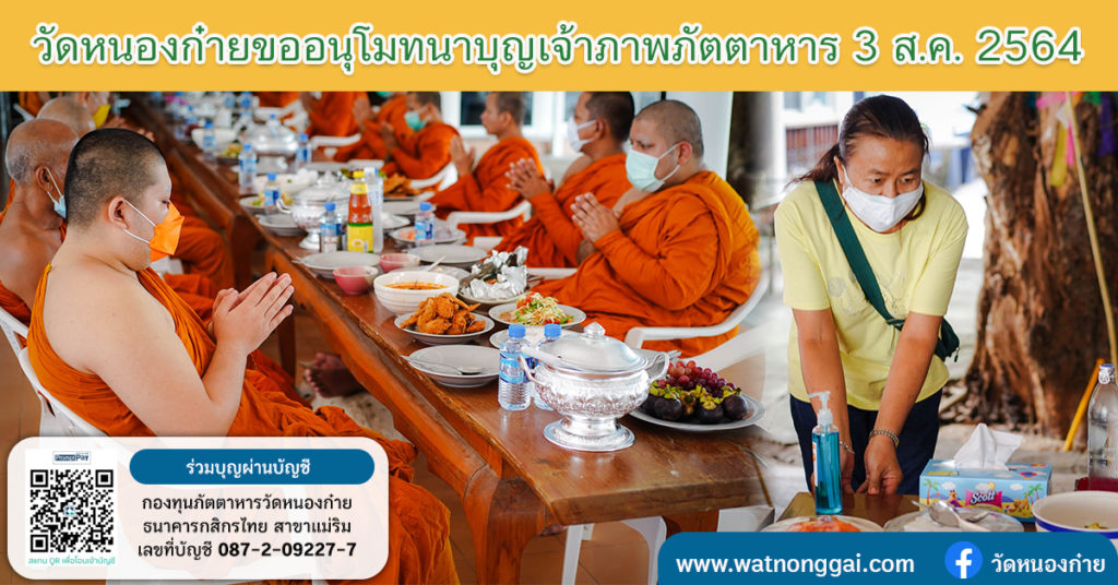 ร่วมบุญผ่านบัญชีธนาคารกสิกรไทย สาขาแม่ริม ชื่อบัญชี กองทุนภัตตาหารวัดหนองก๋าย เลขที่บัญชี 087-2-09227-7