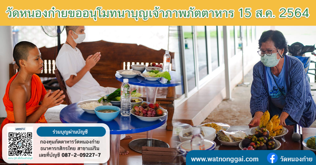 ร่วมบุญผ่านบัญชีธนาคารกสิกรไทย สาขาแม่ริม ชื่อบัญชี กองทุนภัตตาหารวัดหนองก๋าย เลขที่บัญชี 087-2-09227-7