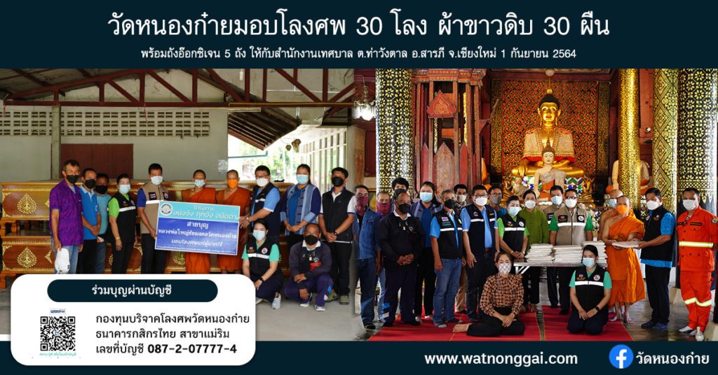 1 กันยายน 2564 วัดหนองก๋ายขออนุโมทนาบุญกับเจ้าภาพทุกท่านที่ได้ร่วมบุญมอบโลงศพ 30 โลง พร้อมผ้าขาวดิบ 30 ผืน ถังอ๊อกซิเจน 5 ถัง พร้อมกับกับเครื่องคุมความดัน 5 ถัง ให้กับสำนักงานเทศบาล ต.ท่าวังตาล อ.สารภี จ.เชียงใหม่