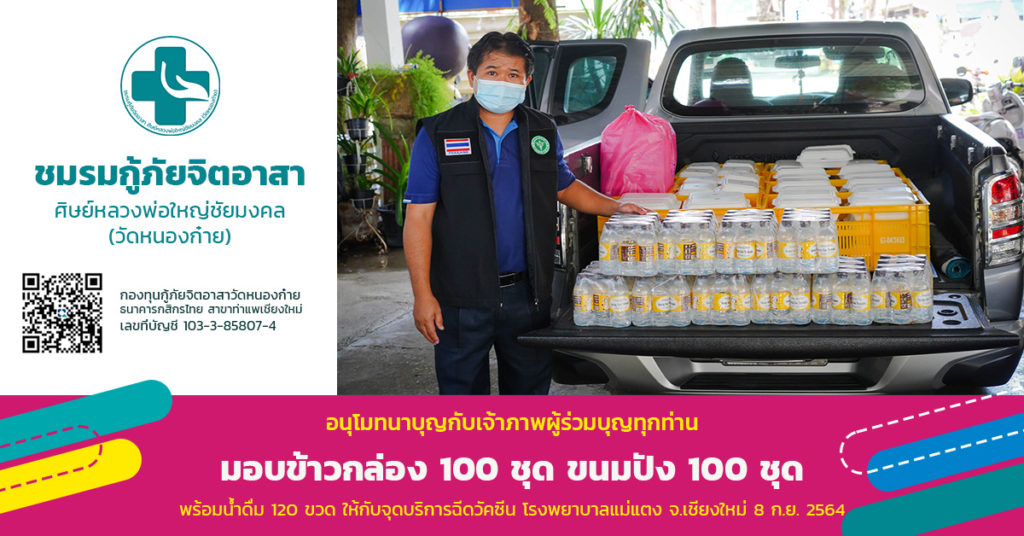8 กันยายน 2564 ชมรมกู้ภัยจิตอาสาศิษย์หลวงพ่อใหญ่ชัยมงคลวัดหนองก๋ายมอบข้าวกล่อง 100 ชุด พร้อมขนมปังหลากหลายไส้ จำนวน 100 ชุด น้ำดื่ม 120 ขวด ให้กับเจ้าหน้าที่และประชาชน ณ จุดฉีดวัคซีนโรงพยาบาลแม่แตง จังหวัดเชียงใหม่