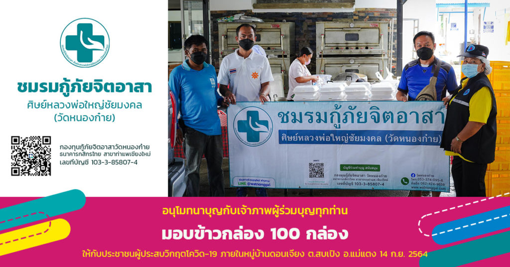 14 กันยายน 2564 ชมรมกู้ภัยจิตอาสาศิษย์หลวงพ่อใหญ่ชัยมงคลวัดหนองก๋ายมอบข้าวกล่อง 100 กล่องให้กับประชาชนในหมู่บ้านดอนเจียง ต.สบเปิง อ.แม่แตง จ.เชียงใหม่ ซึ่งเป็นะประชาชนที่ได้รับผลกระทบจากวิกฤตโควิด-19 ภายในหมู่บ้าน