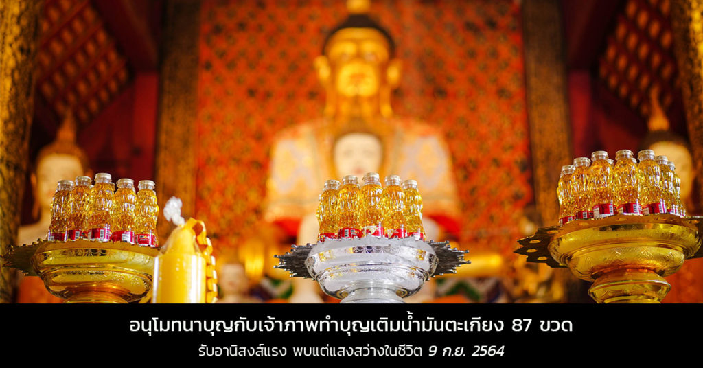 การถวายน้ำมันตะเกียง หรือการทำบุญด้วยการเติมน้ำมันตะเกียง มีความเชื่อกันว่าจะช่วยให้ชีวิตของคุณ มีแสงสว่างในจิตใจและสติปัญญา ความคิด เมื่อชีวิตรุ่งโรจน์โชติช่วงก็ทำให้ปัญหา อุปสรรคต่างๆ ที่ทำให้ชีวิตคุณมืดมิดลงก็มลายหายไป ฐานะทางการเงินดีขึ้น มีเงินใช้ไม่ขาดมือ