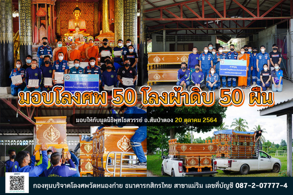 20 ตุลาคม 2564 วัดหนองก๋ายมอบโลงศพ 50 โลง ผ้าขาวดิบ 50 ผืน ให้กับมูลนิธิพุทไธสวรรย์จังหวัดเชียงใหม่ อ.สันป่าตอง โลงศพและผ้าดิบเหล่านี้ได้รับการบริจาคจากเจ้าภาพทุกท่านทำให้การบริจาคโลงศพในครั้งนี้สำเร็จไปได้ด้วยดี