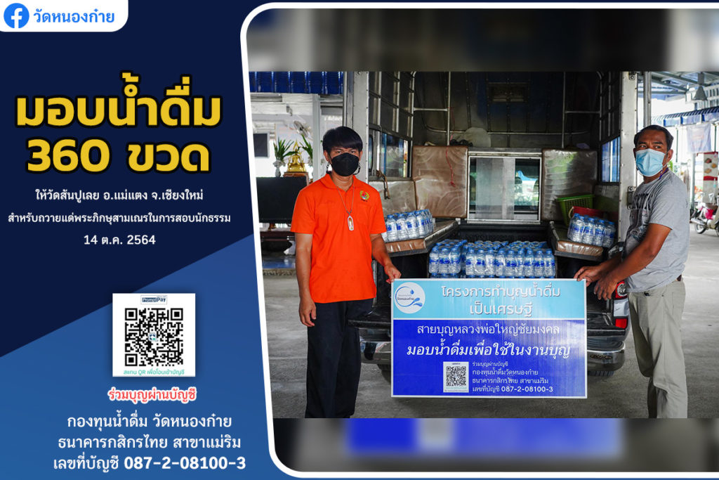 อนุโมทนาบุญกับเจ้าภาพที่ร่วมบริจาคน้ำดื่ม 360 ขวด และนำถวายให้กับวัดสันปูเลย อ.แม่แตง จ.เชียงใหม่ สำหรับใช้ในงานสอบนักธรรมประจำปี 2564