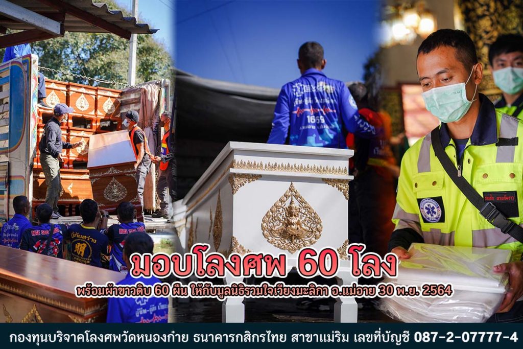 30 พฤศจิกายน 2564 วัดหนองก๋ายได้มอบโลงศพจำนวน 60 โลงพร้อมผ้าขาวดิบจำนวน 60 ผืนที่ได้รับการสนับสนุนร่วมบุญจากเจ้าภาพทุกท่าน มอบให้กับมูลนิธิรวมใจเวียงมะลิกา อ.แม่อาย จ.เชียงใหม่ ซึ่งโลงศพนี้จะได้นำไปส่งมอบต่อและกระจายกับหน่วยกู้ภัยภายในอำเภอต่อไป