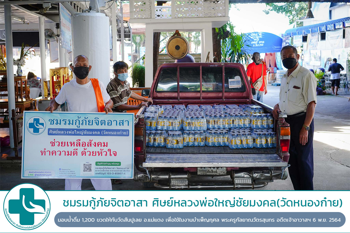 6 พฤศจิกายน 2564 ชมรมกู้ภัยจิตอาสาศิษย์หลวงพ่อใหญ่ชัยมงคลวัดหนองก๋ายมอบน้ำดื่ม 1,200 ขวดให้กับวัดสันปูเลย อ.แม่แตง จ.เชียงใหม่ สำหรับใช้ในงานบำเพ็ญกุศล พระครูกัลยาณวัตรสุนทร อดีตเจ้าอาวาสวัดสันปูเลย