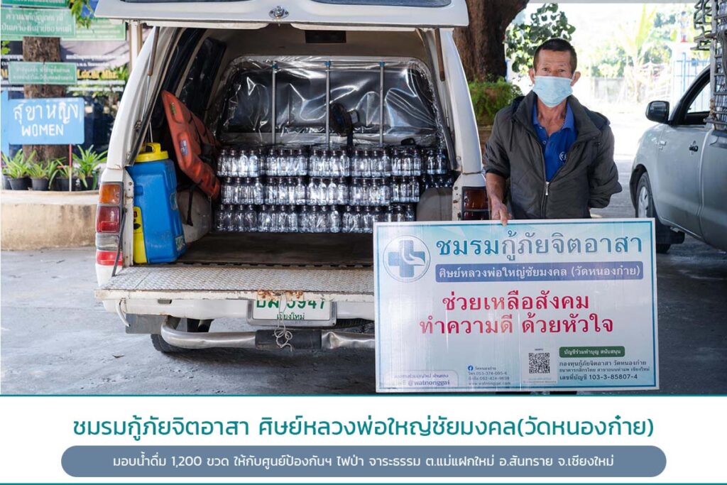 31 มกราคม 2565 ชมรมกู้ภัยจิตอาสาศิษย์หลวงพ่อใหญ่ชัยมงคลวัดหนองก๋ายมอบน้ำดื่ม 1,200 ขวดให้กับศูนย์ป้องกันและแก้ไขปัญหาหมอกควันไฟป่าจาระธรรม ต.แม่แฝกใหม่ อ.สันทราย จ.เชียงใหม่
