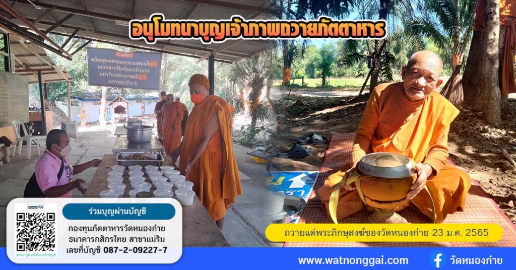 วัดหนองก๋ายขออนุโมทนาบุญกับเจ้าภาพถวายภัตตาหาร สร้างมหาทานบารมีถวายเป็นสังฆทานแด่พระภิกษุสงฆ์ของทางวัดฯ และ พระภิกษุที่มาปฏิบัติธรรม ณ ศูนย์ปฏิบัติธรรมวัดหนองก๋าย สำหรับผู้ที่สนใจสามารถร่วมบุญถวายภัตตาหารได้ทุกๆ วัน ทั้งที่มาด้วยตนเองทางวัดก็จะทำการจัดสถานที่เพื่ออำนวยความสะดวกแก่ทุกท่าน หรือสามารถทำบุญออนไลน์ ถวายภัตตาหาร เช้า เพล ทางวัดจะทำการจัดสรรภัตตาหารที่ดีที่สุด ปราณีตที่สุดตามกำลังศรัทธาของญาติโยมที่ร่วมบุญ เนื่องในวันพิเศษต่างๆ ทำบุญสะเดาะเคราะห์ ทำบุญวันเกิดตามที่ทางเจ้าภาพต้องการ