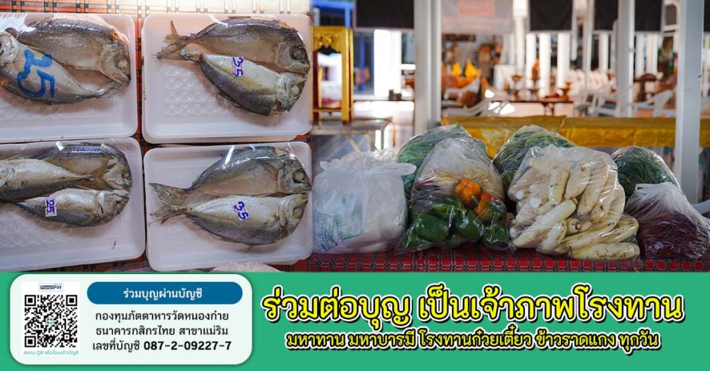 ร่วมบุญผ่านบัญชีธนาคารกสิกรไทย สาขาแม่ริม ชื่อบัญชี กองทุนภัตตาหารวัดหนองก๋าย เลขที่บัญชี 087-2-09227-7