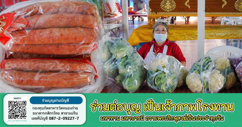 ร่วมบุญผ่านบัญชีธนาคารกสิกรไทย สาขาแม่ริม ชื่อบัญชี กองทุนภัตตาหารวัดหนองก๋าย เลขที่บัญชี 087-2-09227-7