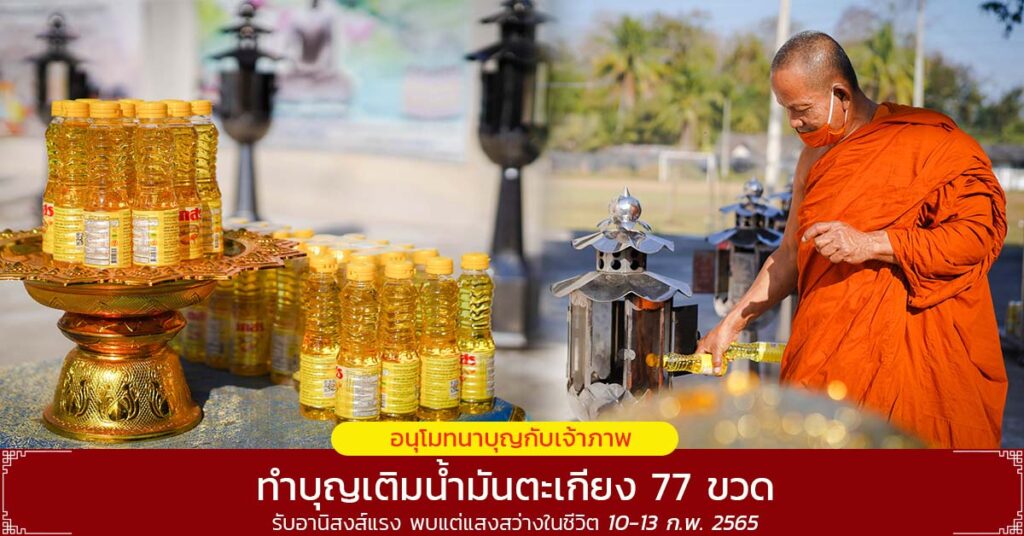การถวายน้ำมันตะเกียง หรือการทำบุญด้วยการเติมน้ำมันตะเกียง มีความเชื่อกันว่าจะช่วยให้ชีวิตของคุณ มีแสงสว่างในจิตใจและสติปัญญา ความคิด เมื่อชีวิตรุ่งโรจน์โชติช่วงก็ทำให้ปัญหา อุปสรรคต่างๆ ที่ทำให้ชีวิตคุณมืดมิดลงก็มลายหายไป ฐานะทางการเงินดีขึ้น มีเงินใช้ไม่ขาดมือ
