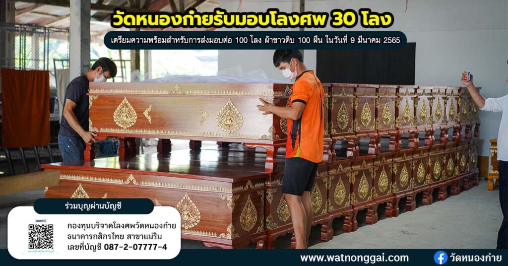 2 มี.ค. 2565 วัดหนองก๋ายได้รับมอบโลงศพจำนวน 30 โลงที่ได้รับการร่วมบุญบริจาคจากเจ้าภาพทุกท่านเตรียมความพร้อมสำหรับการส่งมอบต่อไปในเดือน มีนาคม 2565