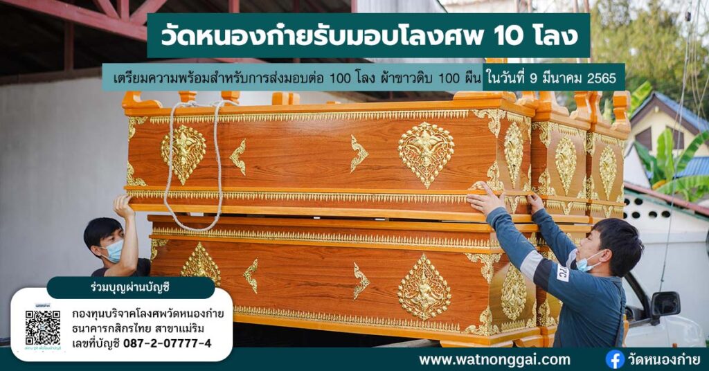 8 มี.ค. 2565 วัดหนองก๋ายได้รับมอบโลงศพจำนวน 10 โลงที่ได้รับการร่วมบุญบริจาคจากเจ้าภาพทุกท่านเตรียมความพร้อมสำหรับการส่งมอบต่อไปในเดือน มีนาคม 2565