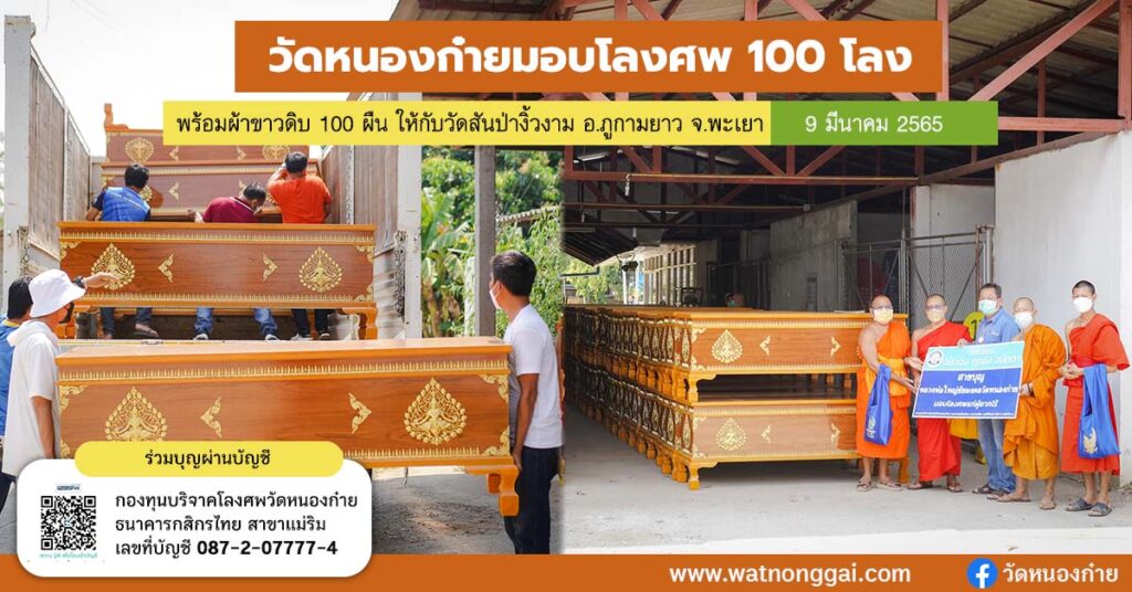 สำเร็จเป็นที่เรียบร้อยแล้ว สำหรับการมอบโลงศพ 100 โลงพร้อมผ้าขาวดิบ 100 ผืน ให้กับวัดสันป่างิ้วงาม อ.ภูกามยาว จ.พะเยา วัดหนองก๋ายขออนุโมทนาบุญกับเจ้าภาพทุกท่านที่ได้ร่วมเป็นส่วนหนึ่งในการมอบโลงศพในครั้งนี้ โลงศพในชุดนี้จะทำการส่งมอบต่อกระจายไปใช้ภายในพื้นที่ต่อไป