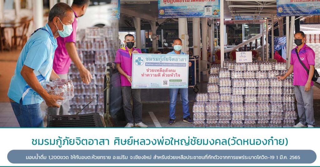 1 มีนาคม 2565 วัดหนองก๋ายอนุโมทนาบุญกับเจ้าภาพที่ได้มอบน้ำดื่ม 1,200 ขวดให้กับ องค์การบริหารส่วนตำบลห้วยทราย อ.แม่ริม จ.เชียงใหม่สำหรับช่วยเหลือประชาชนในพื้นที่ ที่ได้รับผลกระทบจากโรคระบาดโควิด-19 และต้องทำการกักตัวภายในพื้นที่การรับผิดชอบของทางอบต.ห้วยทราย