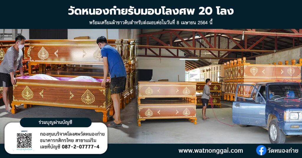 6 เม.ย. 2565 วัดหนองก๋ายได้รับมอบโลงศพจำนวน 20 โลงที่ได้รับการร่วมบุญบริจาคจากเจ้าภาพทุกท่านเตรียมความพร้อมสำหรับการส่งมอบต่อไปในเดือน เมษายน 2565 พร้อมกับเตรียมผ้าขาวดิบสำหรับการส่งมอบต่อไปเช่นกัน