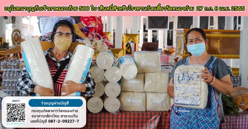วัดหนองก๋ายขออนุโมทนาบุญกับเจ้าภาพถวายถ้วยกกระดาษ 500 ใบ เส้นหมี่ 27 ก.ก. สำหรับโรงทานก๋วยเตี๋ยววัดหนองก๋าย
