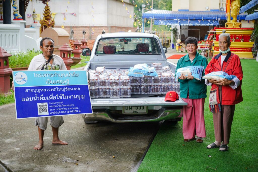 น้ำดื่มส่วนนึ่งมอบแด่พระภิกษุสงฆ์ผู้ปฏิบัติธรรม ตามศูนย์ปฏิบัติธรรมต่างๆ รวมถึงงานวัดงานบุญที่จัดขึ้น