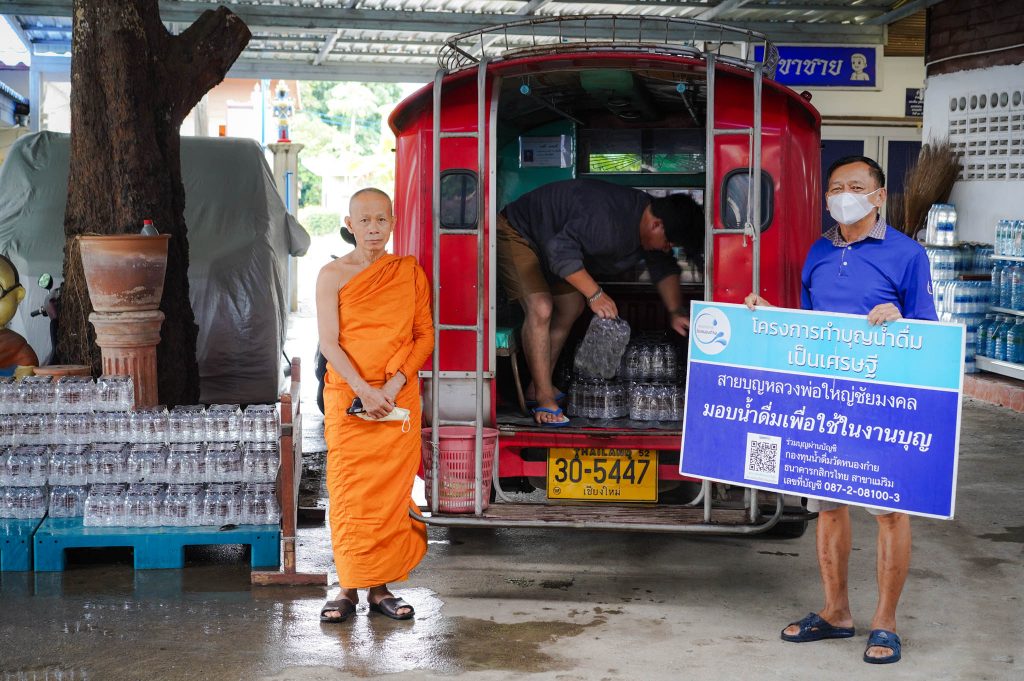 น้ำดื่มส่วนนึ่งมอบแด่พระภิกษุสงฆ์ผู้ปฏิบัติธรรม ตามศูนย์ปฏิบัติธรรมต่างๆ รวมถึงงานวัดงานบุญที่จัดขึ้น