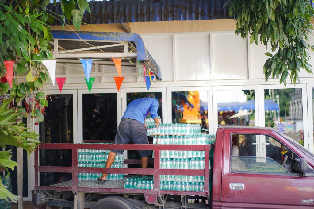 น้ำดื่มวัดหนองก๋ายนำมาส่งในแต่ละครั้งมากกว่า 500 แพ็ค 6,000 ขวดเพื่อให้เพียงพอต่อความต้องการในแต่ละครั้ง