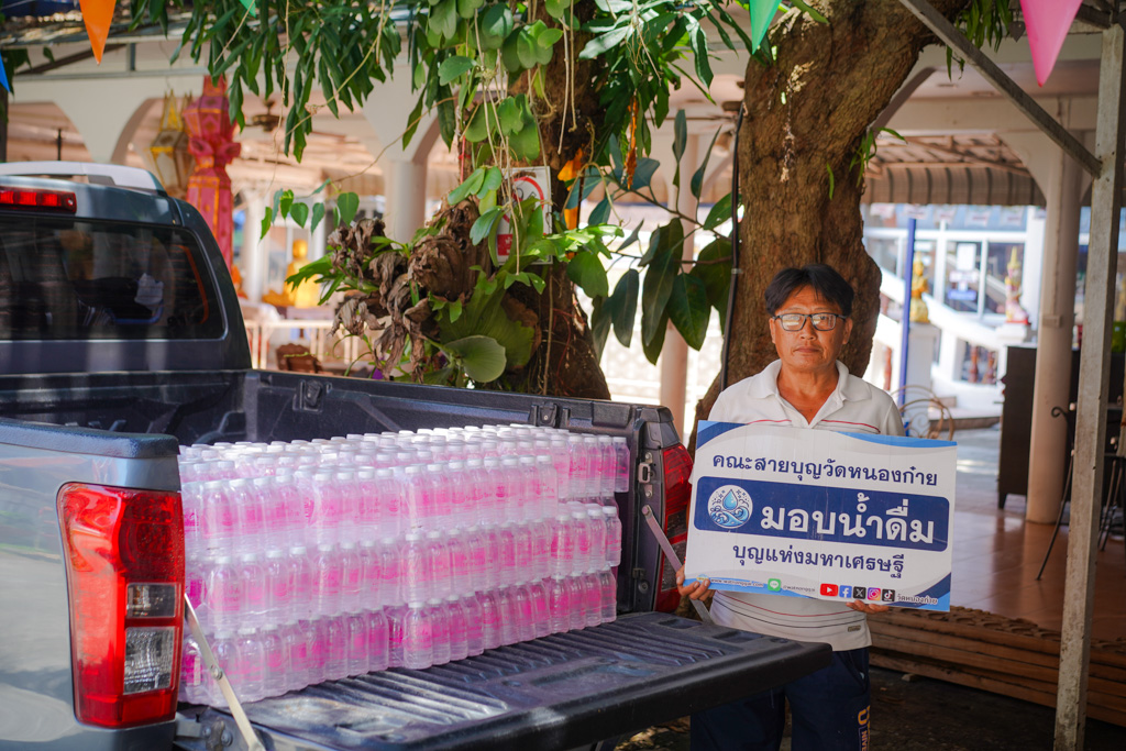 น้ำดื่มวัดหนองก๋ายนำมาส่งในแต่ละครั้งมากกว่า 500 แพ็ค 6,000 ขวดเพื่อให้เพียงพอต่อความต้องการในแต่ละครั้ง