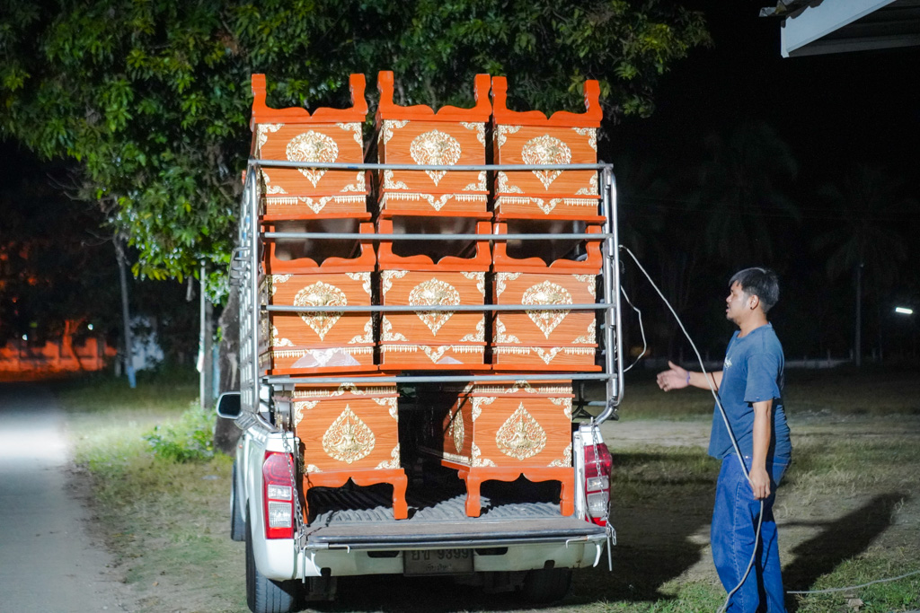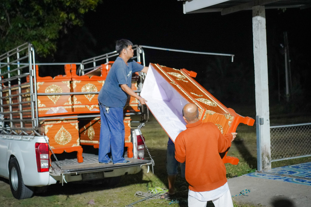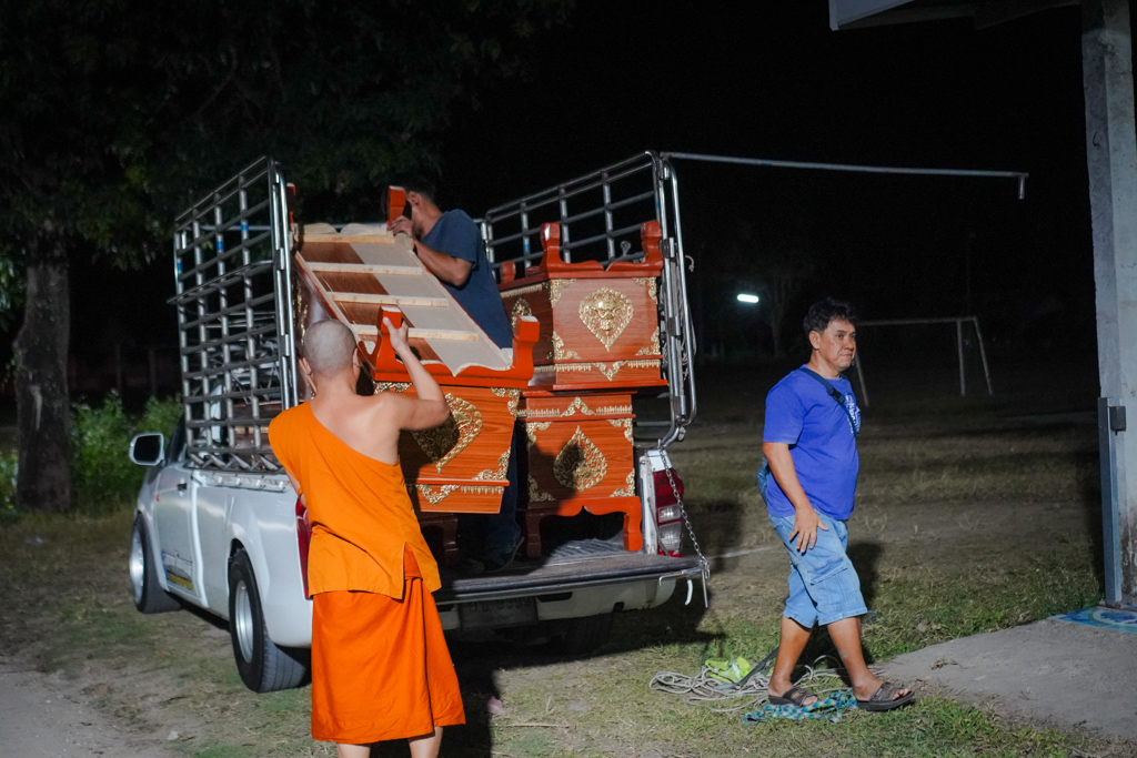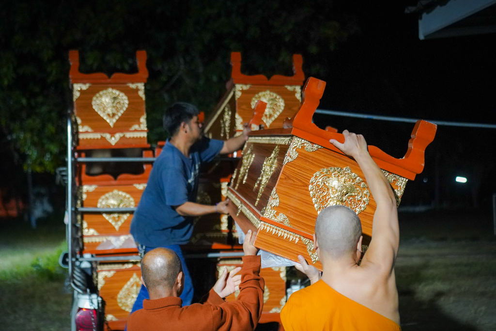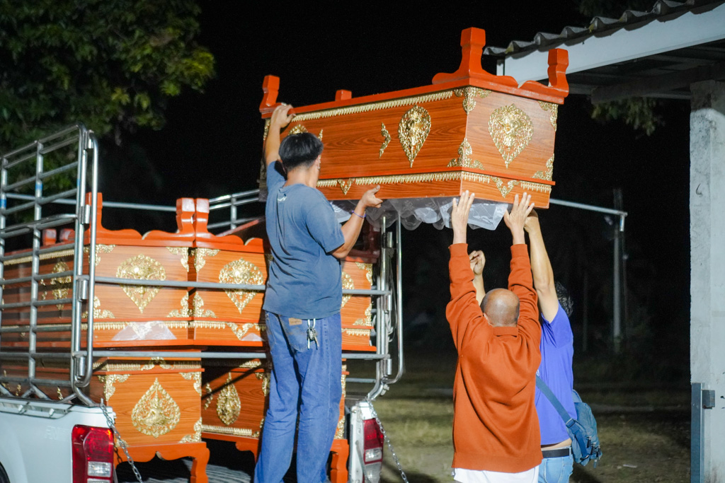 วัดหนองก๋ายเตรียมส่งมอบ โลงศพจำนวน 10 โลง พร้อมผ้าดิบห่อศพ 10 ผืน