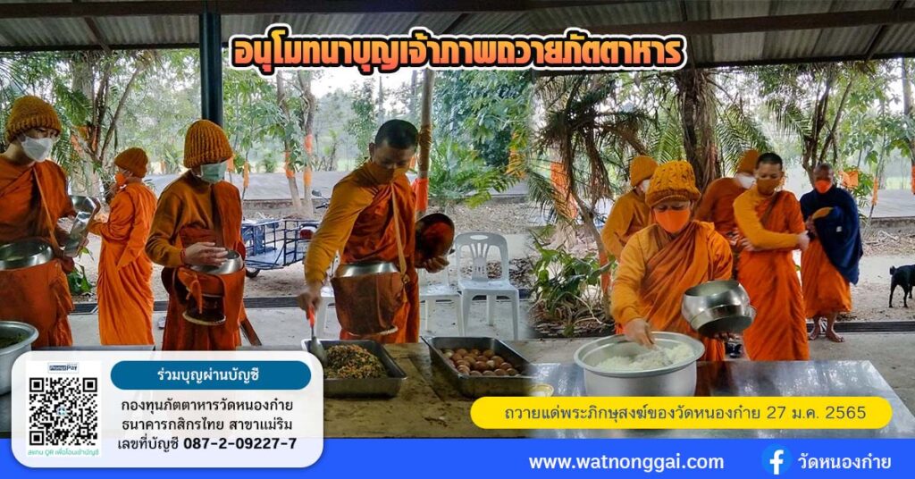 วัดหนองก๋ายขออนุโมทนาบุญกับเจ้าภาพถวายภัตตาหาร สร้างมหาทานบารมีถวายเป็นสังฆทานแด่พระภิกษุสงฆ์ของทางวัดฯ และ พระภิกษุที่มาปฏิบัติธรรม ณ ศูนย์ปฏิบัติธรรมวัดหนองก๋าย สำหรับผู้ที่สนใจสามารถร่วมบุญถวายภัตตาหารได้ทุกๆ วัน ทั้งที่มาด้วยตนเองทางวัดก็จะทำการจัดสถานที่เพื่ออำนวยความสะดวกแก่ทุกท่าน หรือสามารถทำบุญออนไลน์ ถวายภัตตาหาร เช้า เพล ทางวัดจะทำการจัดสรรภัตตาหารที่ดีที่สุด ปราณีตที่สุดตามกำลังศรัทธาของญาติโยมที่ร่วมบุญ เนื่องในวันพิเศษต่างๆ ทำบุญสะเดาะเคราะห์ ทำบุญวันเกิดตามที่ทางเจ้าภาพต้องการ