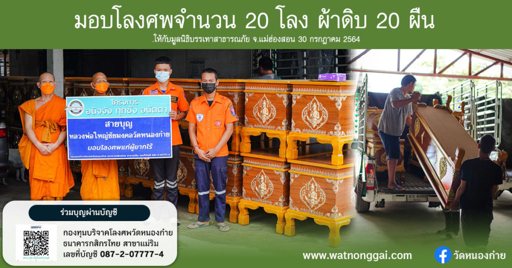 วัดหนองก๋ายมอบโลงศพ 20 โลง ผ้าขาวดิบ 20 ผืนให้กับมูลนิธิบรรเทาสาธารณะภัย จ.แม่ฮ่องสอน 30 ก.ค. 2564
