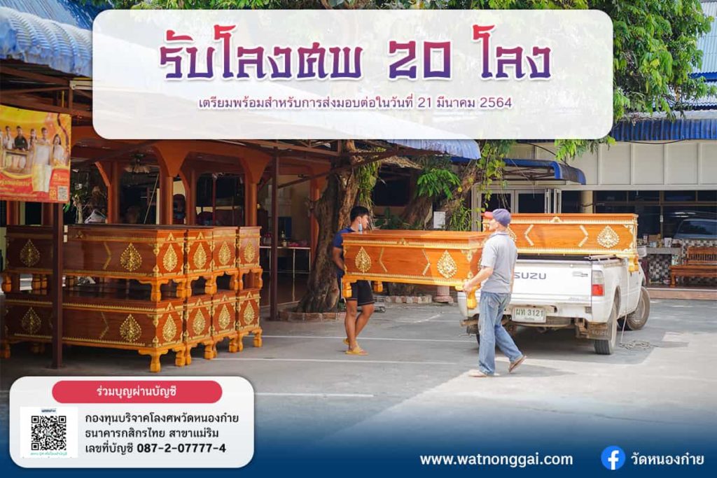 วัดหนองก๋ายรับมอบโลงศพจำนวน 20 โลง เตรียมความพร้อมสำหรับการส่งมอบต่อในวันพรุ่งนี้